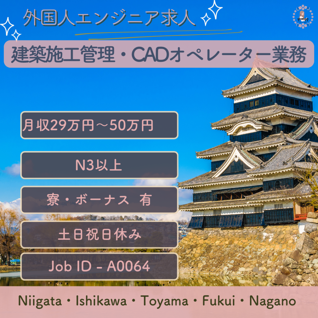 外国人エンジニア求人(正社員)職種   : 土木施工管理Job ID  :A0089業務内容 :創業80年の地域に密着した同社にて、神奈川県中央エリアを中心とした公共工事の土木施工管理のお仕事をお願いします。・安全管理(未然に災害を防ぐ)・...